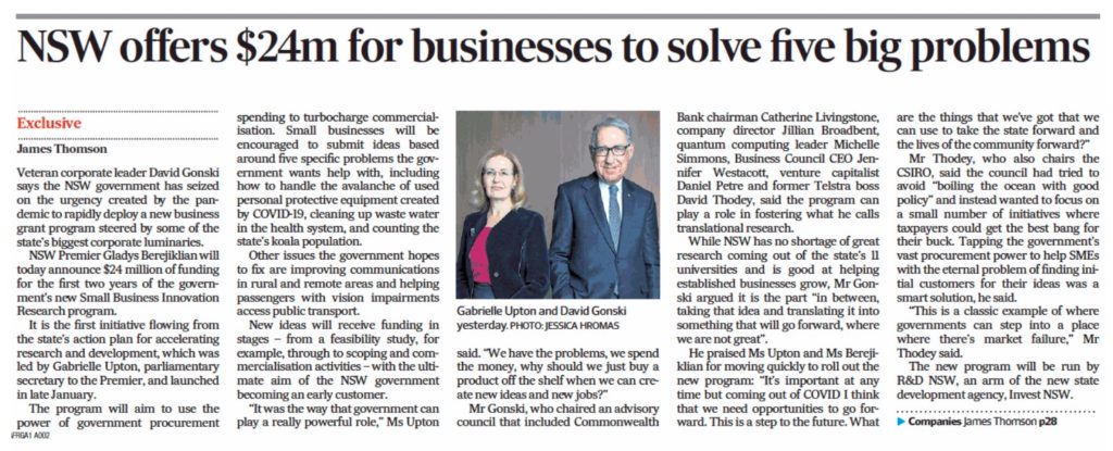 Veteran corporate leader David Gonski says the NSW government has seized on the urgency created by the pandemic to rapidly deploy a new business grant program steered by some of the state’s biggest corporate luminaries.